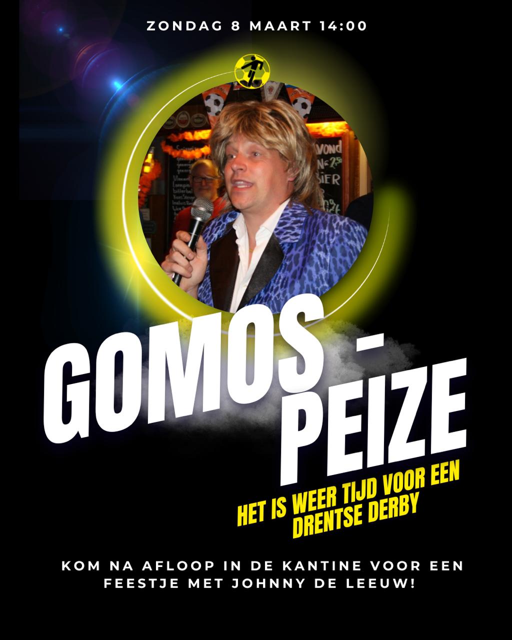 GOMOS – Peize begint zondagmiddag om 14.00 uur en staat onder leiding van scheidsrechter Gerald van Driel uit Beilen. Hij wordt namens GOMOS geassisteerd door René Coenrady. De Pupil van de week is Storm Prkic uit GOMOS JO9. Voorafgaand aan de wedstrijd spelen GOMOS JO10 en Peize JO10 een voorwedstrijd. Deze zal om 13.10 uur starten op het kunstgrasveld. Kom zondagmiddag dus op tijd naar de Schapendrift! Na afloop van de derby is er groot feest in de kantine met een optreden van Johnny de Leeuw! Laten we er met z’n allen weer een groot voetbalfeest van maken! We sluiten af met een oproep aan de supporters van Peize.. het is verboden om stickers te plakken. We zullen hier streng op toe zien en mogelijk maatregelen treffen.